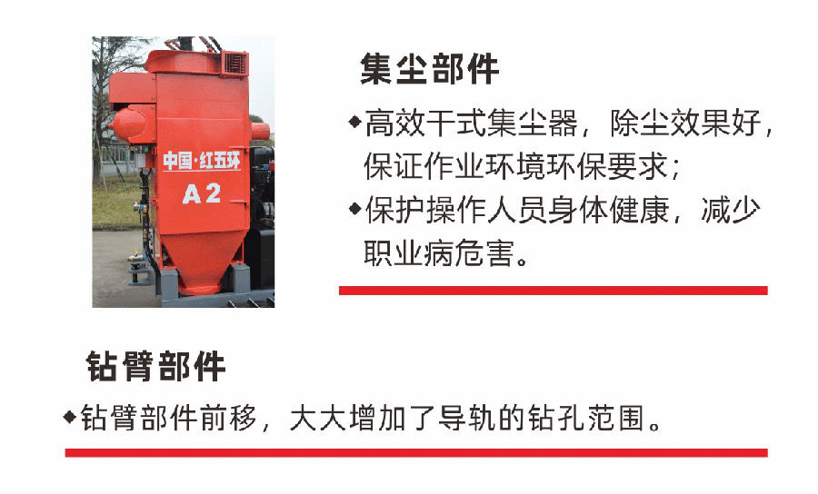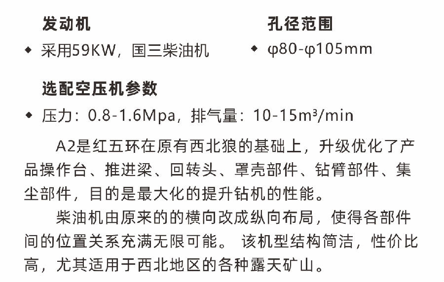 A2是紅五環(huán)在原有西北狼的基礎上,升級優(yōu)化了產品操作臺、推進梁、回轉頭、罩殼部件、鉆臂部件、集塵部件,目的是最大化的提升鉆機的性能。柴油機由原來的的橫向改成縱向布局,使得各部件間的位置關系充滿無限可能。 該機型結構簡潔,性價比高,尤其適用于西北地區(qū)的各種露天礦山。