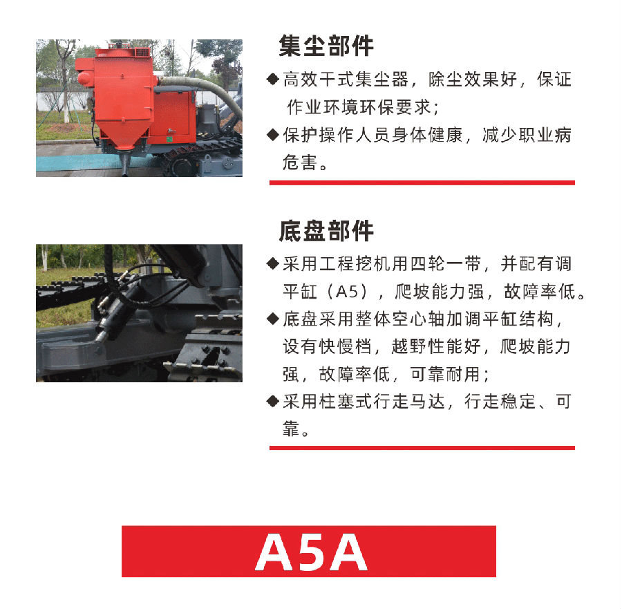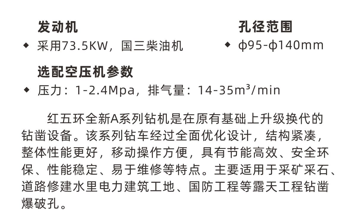 紅五環(huán)全新A系列鉆機(jī)是在原有基礎(chǔ)上升級換代的鉆鑿設(shè)備。該系列鉆車經(jīng)過全面優(yōu)化設(shè)計,結(jié)構(gòu)緊湊,整體性能更好,移動操作方便,具有節(jié)能高效、安全環(huán)保、性能穩(wěn)定、易于維修等特點。主要適用于采礦采石、道路修建水里電力建筑工地、國防工程等露天工程鉆鑿爆破孔。