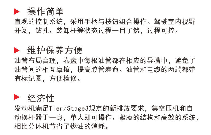 推薦孔徑范圍:110-148mmGIA B9秉承阿特拉斯.科普柯領(lǐng)先的技術(shù)和成熟的潛孔鉆孔方式,具備可靠的性能和高鉆孔質(zhì)量,是一款經(jīng)濟(jì)實(shí)用的履帶式露天潛孔鉆機(jī)。該產(chǎn)品性能可靠,維護(hù)成本低,廣泛適用于采石場和石灰石礦山等的鉆孔作業(yè)。