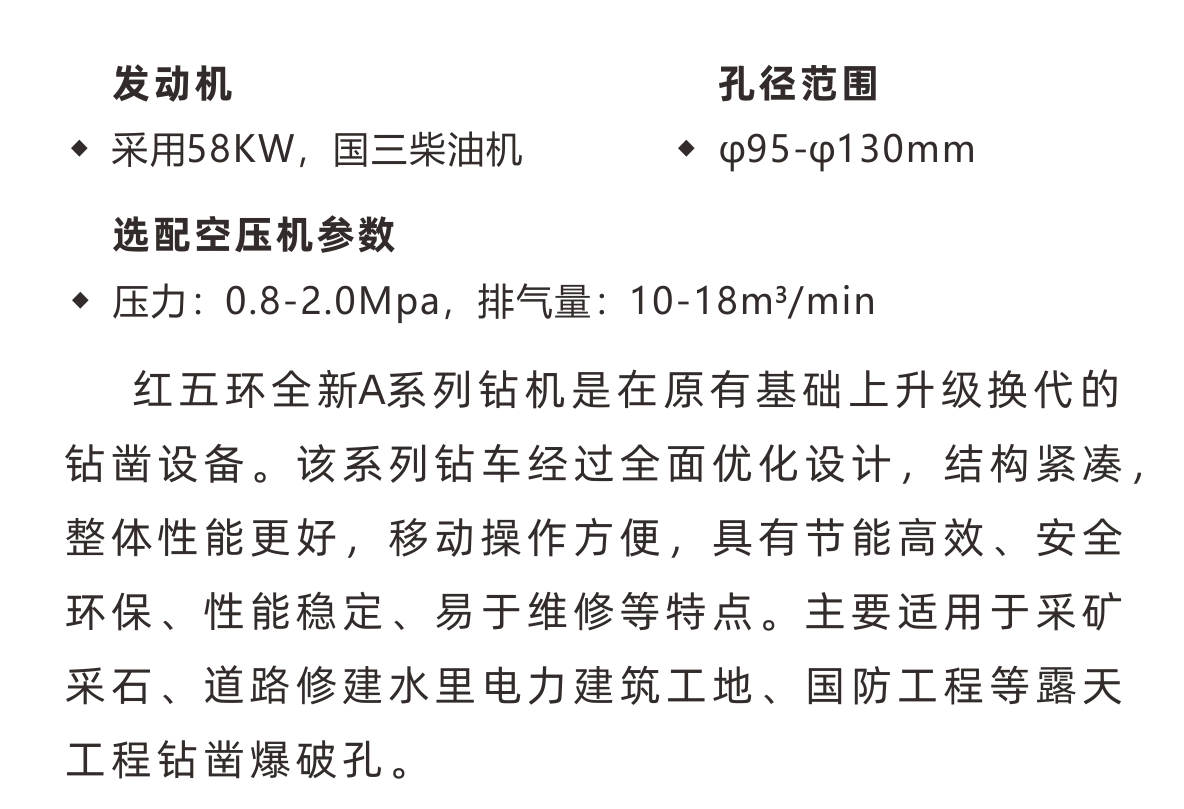 紅五環(huán)全新A系列鉆機是在原有基礎(chǔ)上升級換代的鉆鑿設(shè)備。該系列鉆車經(jīng)過全面優(yōu)化設(shè)計,結(jié)構(gòu)緊湊,整體性能更好,移動操作方便,具有節(jié)能高效、安全環(huán)保、性能穩(wěn)定、易于維修等特點。主要適用于采礦采石、道路修建水里電力建筑工地、國防工程等露天工程鉆鑿爆破孔。